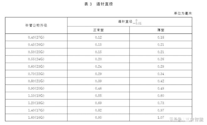 针孔的通畅性直接影响药液的输送效率。标准规定了不同公称外径针管对应的通针直径要求,如下表所示: