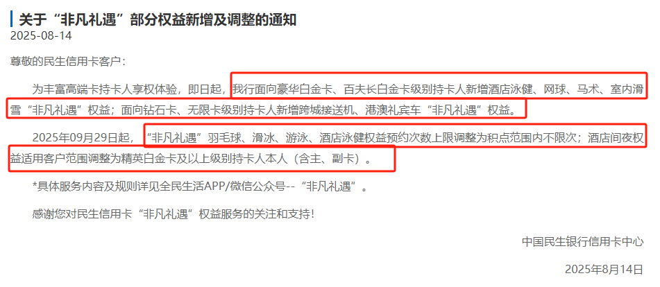 “非凡礼遇”羽毛球、滑冰、游泳、酒店泳健权益预约次数上限调整为积点范围内不限次。
