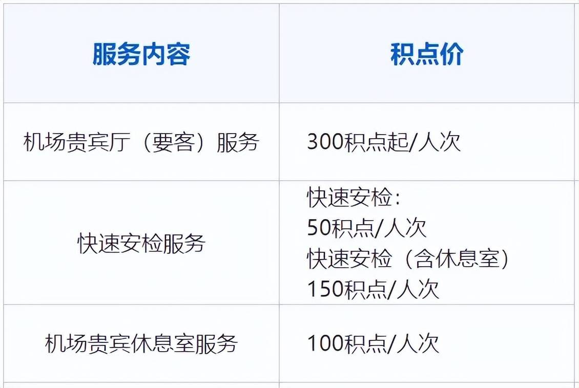 机场贵宾厅:100积点;机场快速安检:50积点;机场快速安检(含休息室):150积点;机场贵宾厅(VIP)、部分含到达:300积点起。