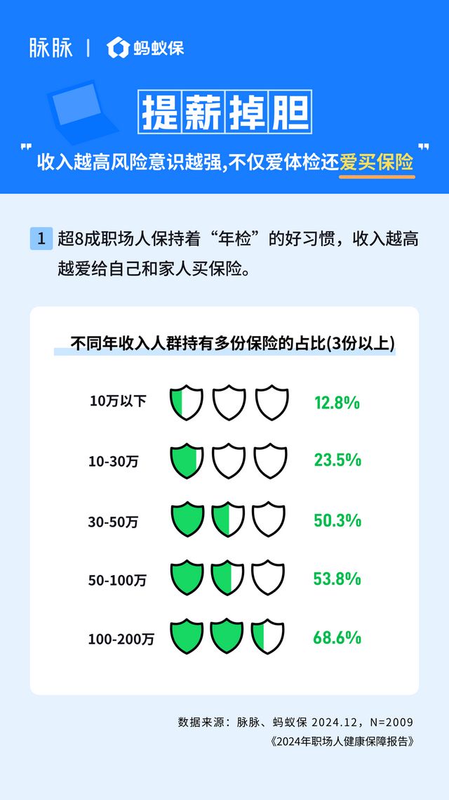 蚂蚁保和脉脉的这次调研显示,收入越高的职场人,对健康和风险的重视意识也会更高:不仅会增加体检频次,更热衷购买保险,这种现象被网友调侃为“提薪掉胆”。数据显示,在高频体检的职场人中,年收入50-100万的职场人占比高达47%,他们为自己和家人持有三份以上保险的占比高达53.8%。