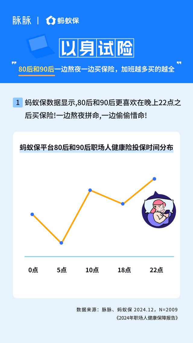 蚂蚁保平台的数据显示,平台上46%的80后、90后用户的第一份保险是健康险,其中晚上10点是80后、90后投保健康险的高峰。“一边熬夜一边买保险”成为青年职场人的投保特点。